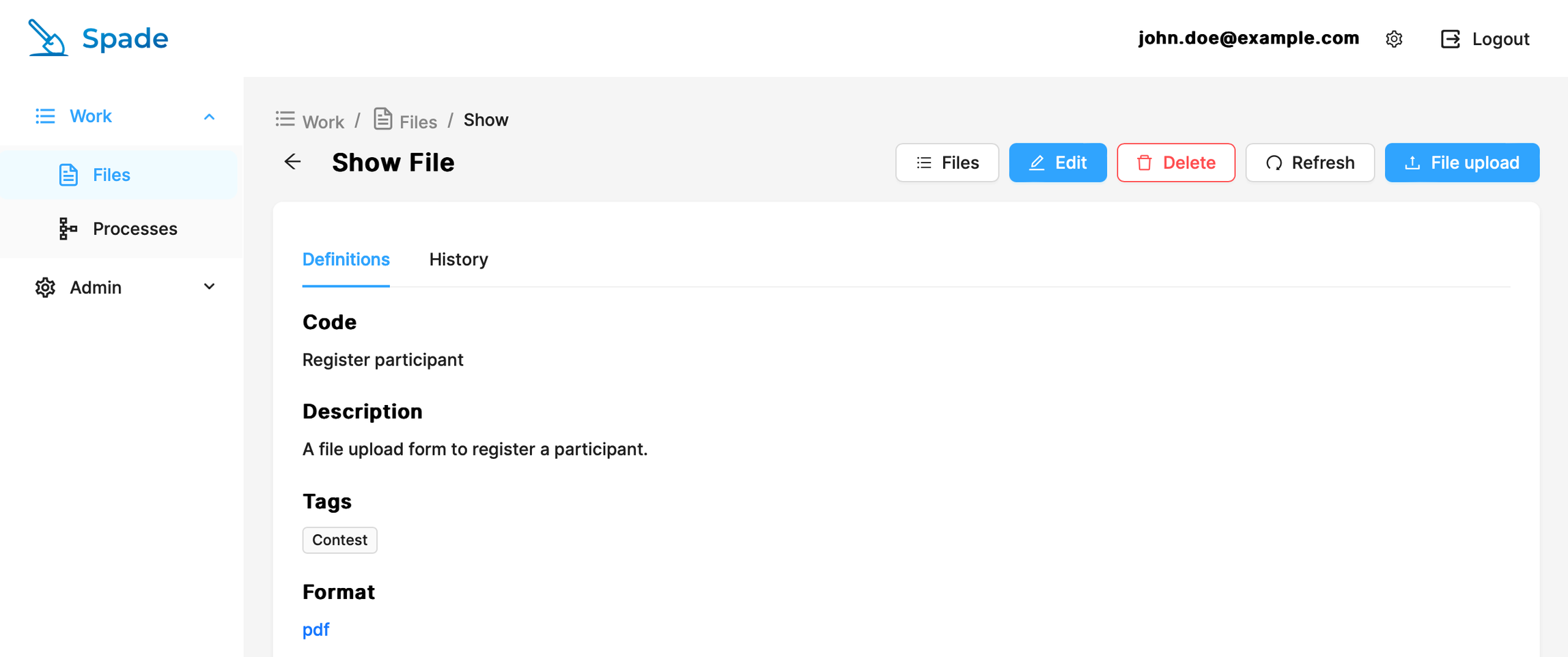 Details view on a file workflow. Note the “History” tab – Spade is auditable and keeps activity logs from previous runs, so you can always trace back to who and when triggered a workflow.