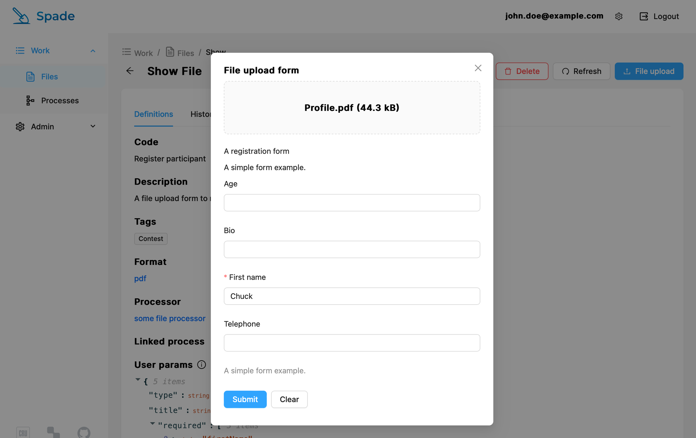 After we hit “File Upload” button, a form is displayed. The form is defined using JSON Schema, which allows the developer to specify fields, their types and simple checks – separately for each File and Process.